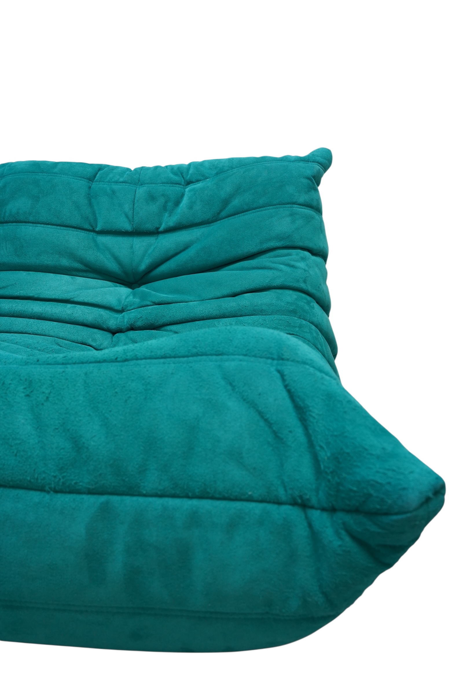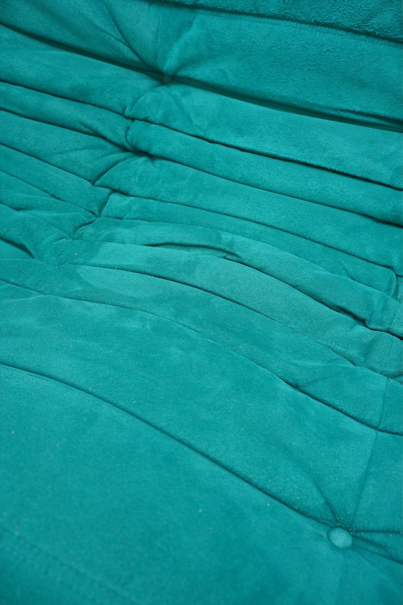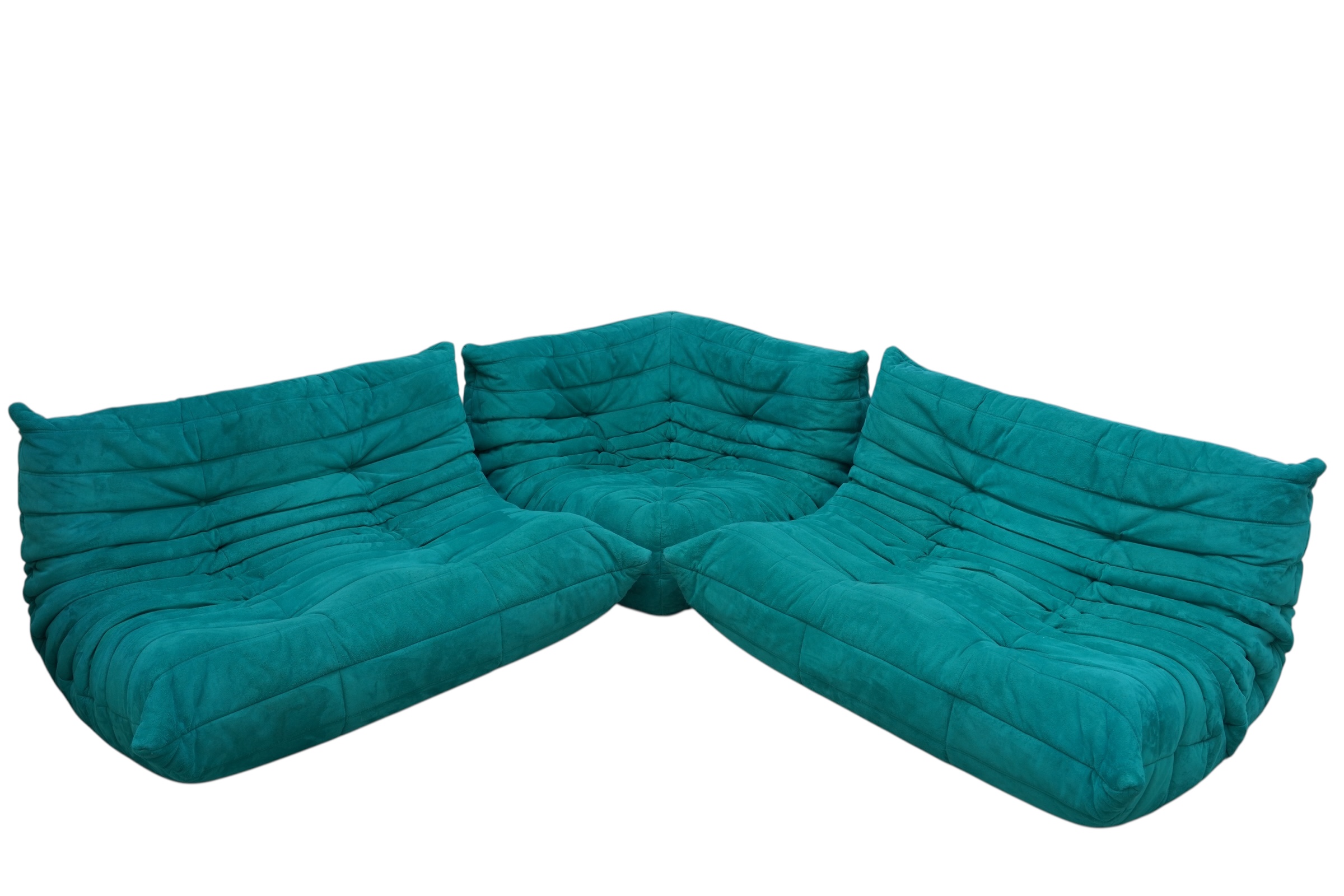 Ensemble de 3 pièces de canapés, modèle TOGO de la Ligne Roset par Michel Ducaroy. Rembourrage en mousse de polyuréthane habillé d’un tissu en alcantara de couleur turquoise.
