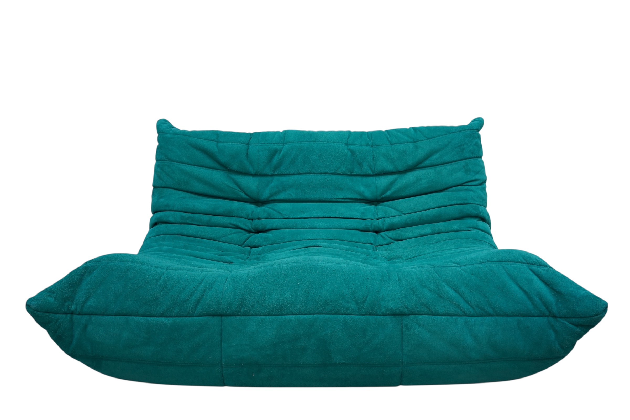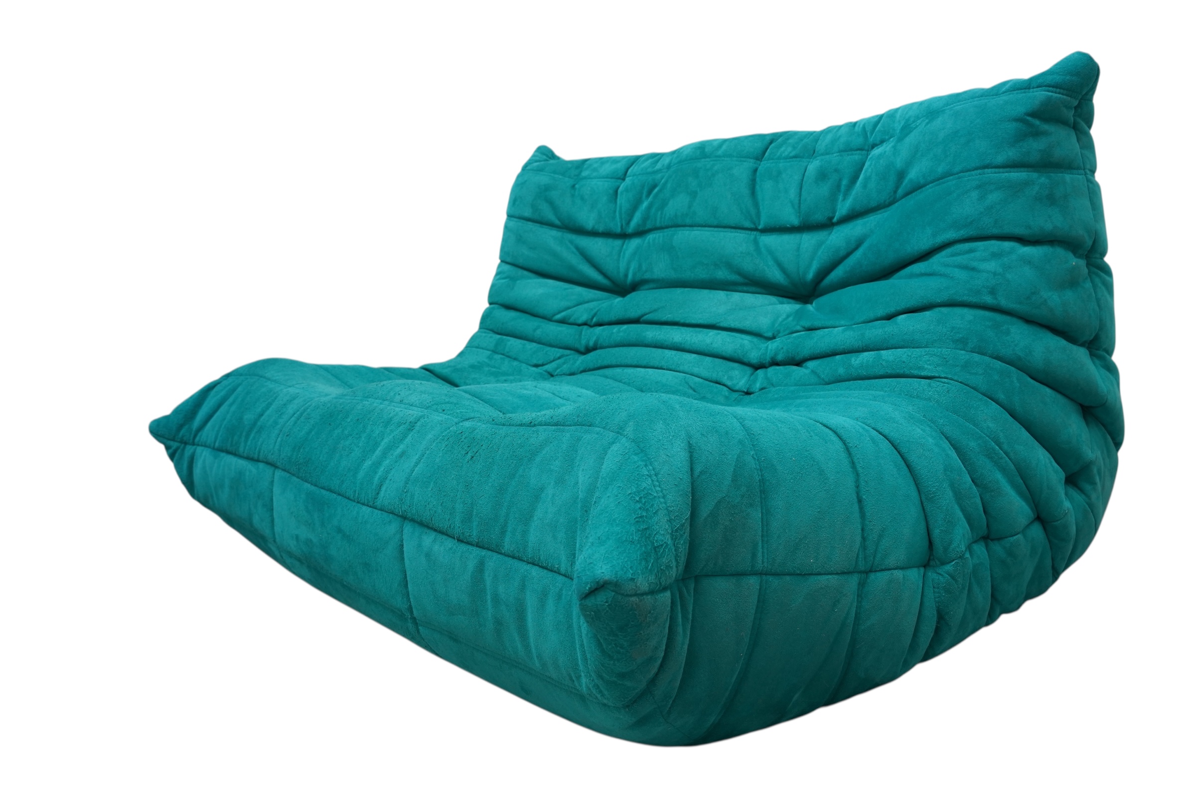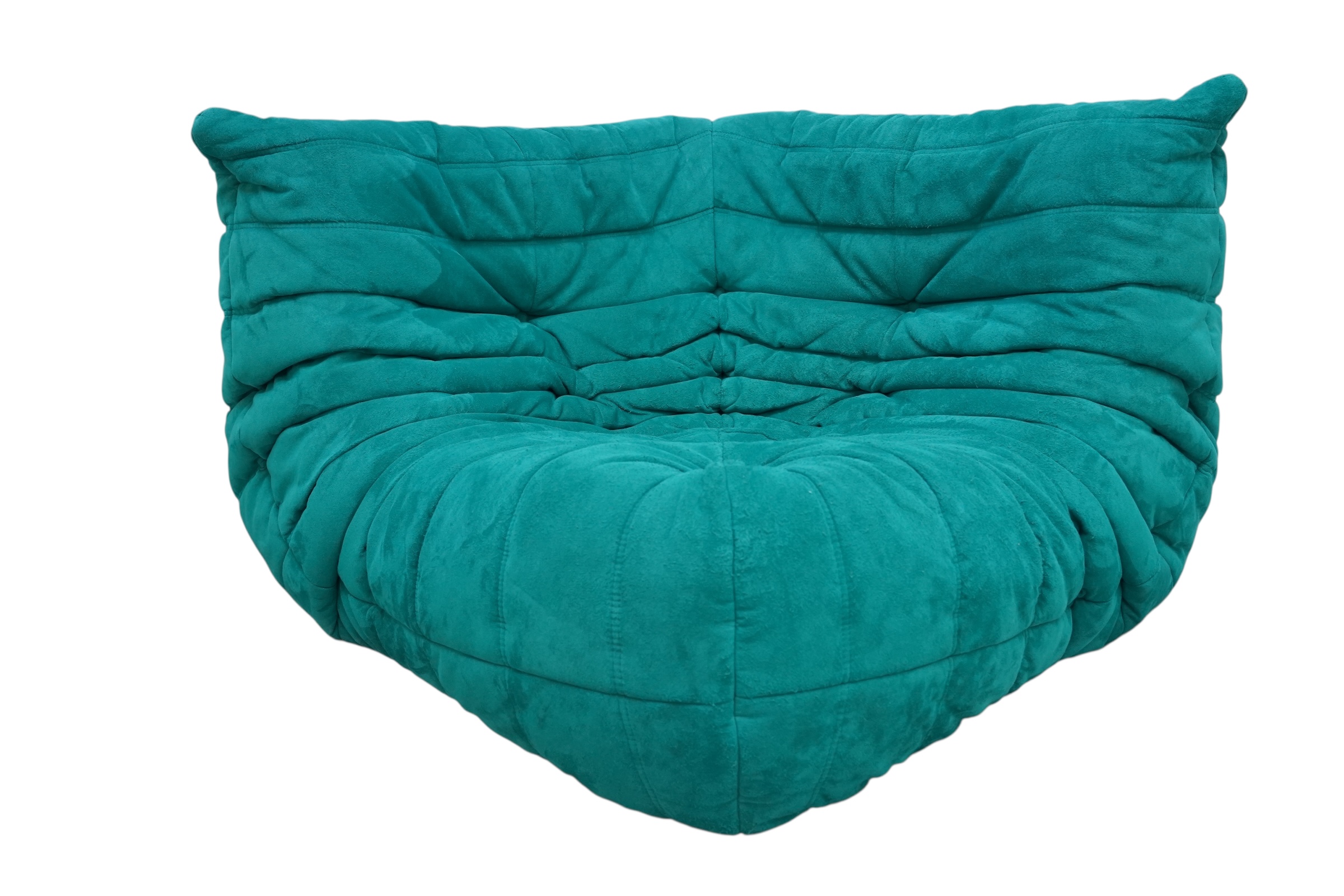 Ensemble de 3 pièces de canapés, modèle TOGO de la Ligne Roset par Michel Ducaroy. Rembourrage en mousse de polyuréthane habillé d’un tissu en alcantara de couleur turquoise.