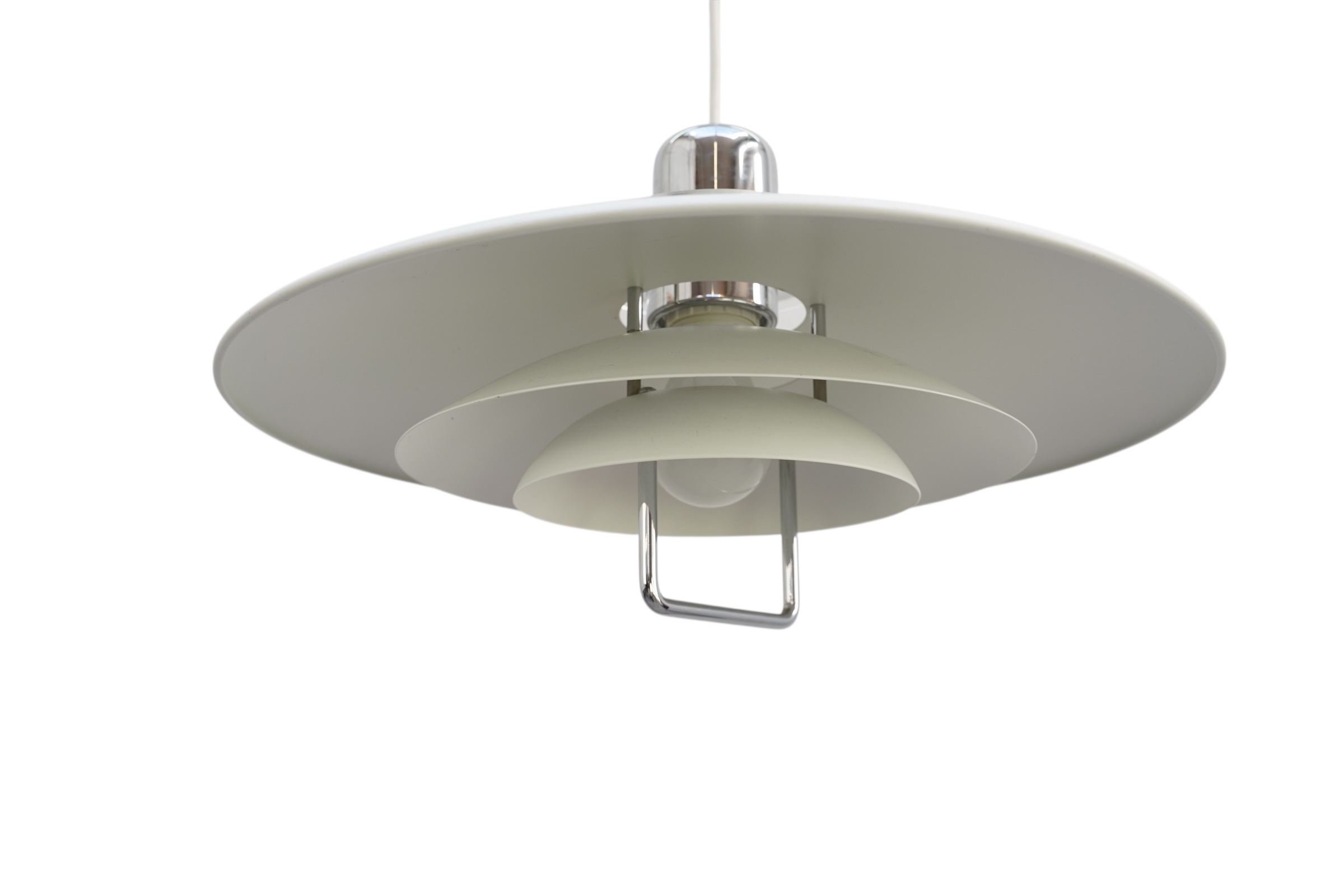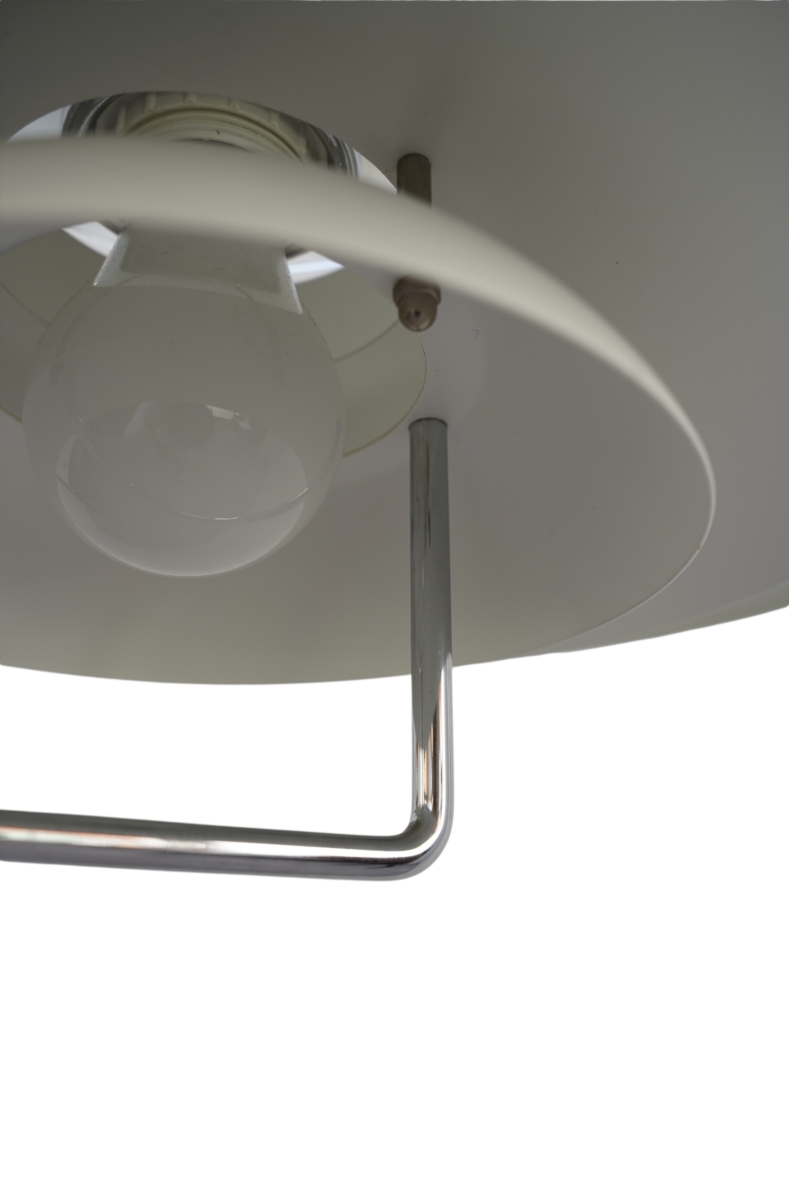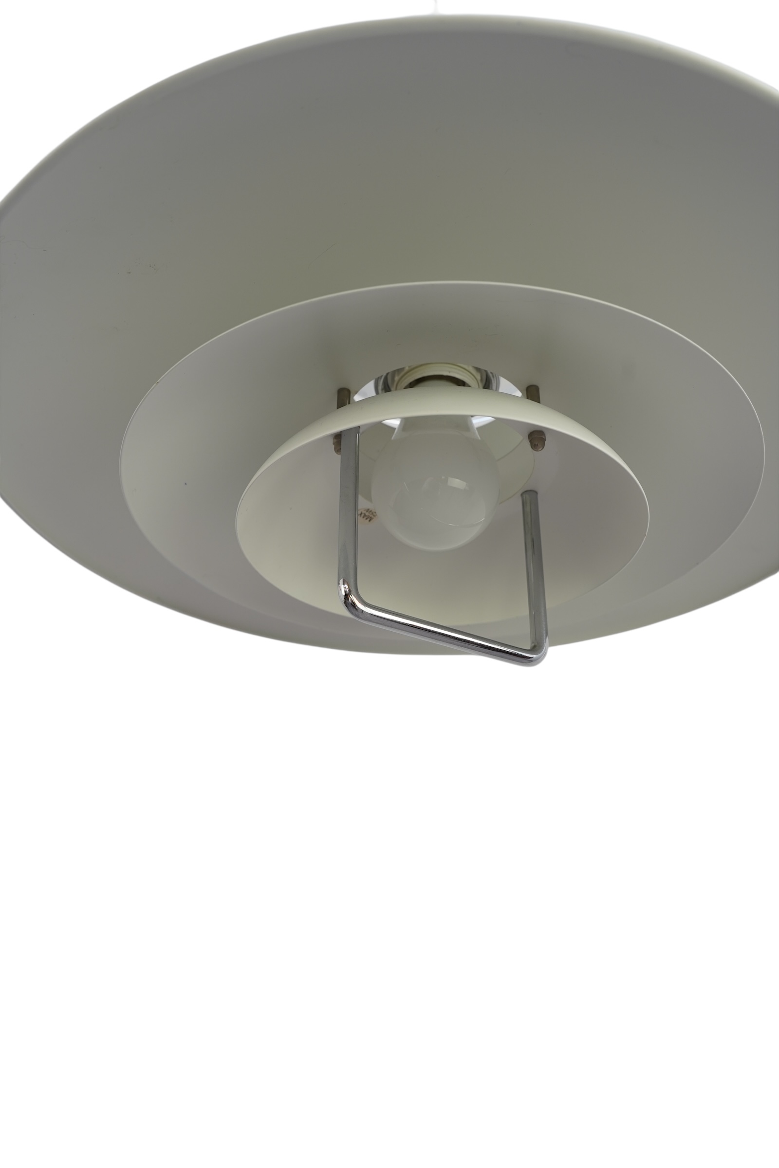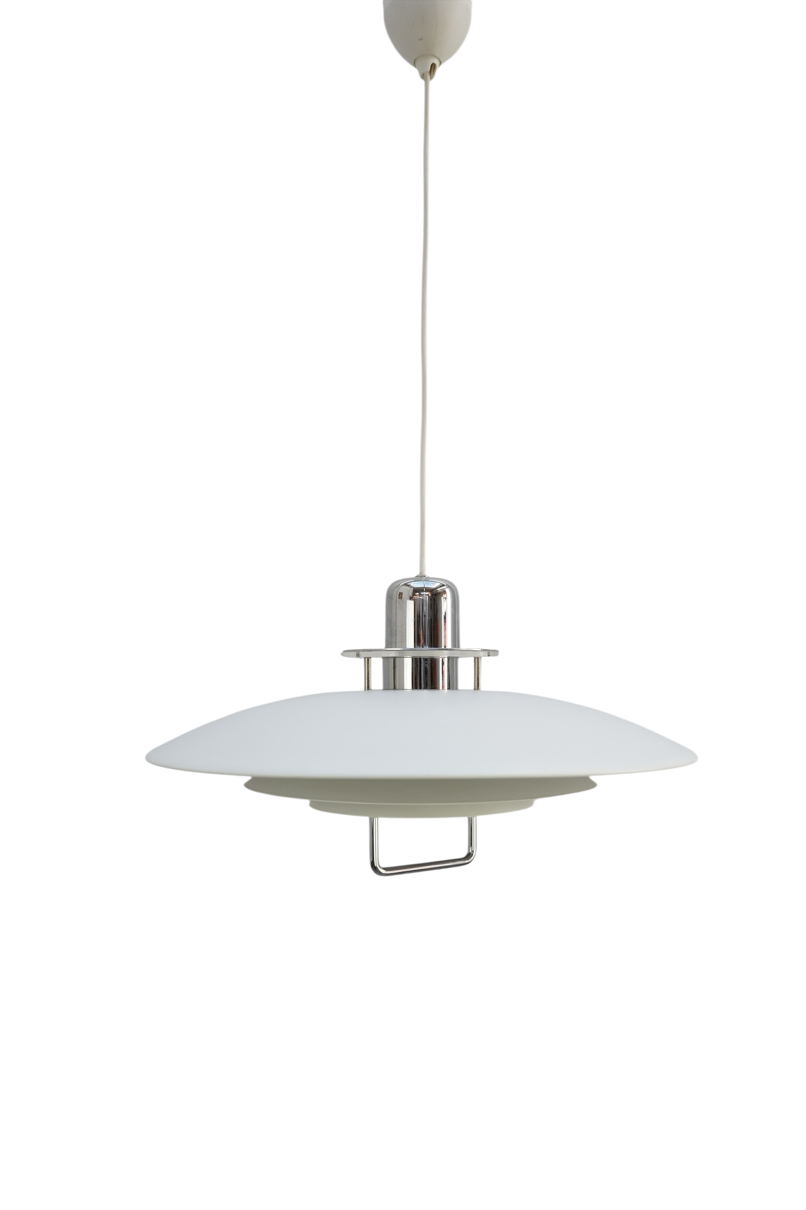 Plafonnier PRIMUS II conçue vers les années 2000’s pour la maison suédoise BELID. Structure en métal laqué de couleur blanche et système de traction intelligent pour ajuster la hauteur de suspension.