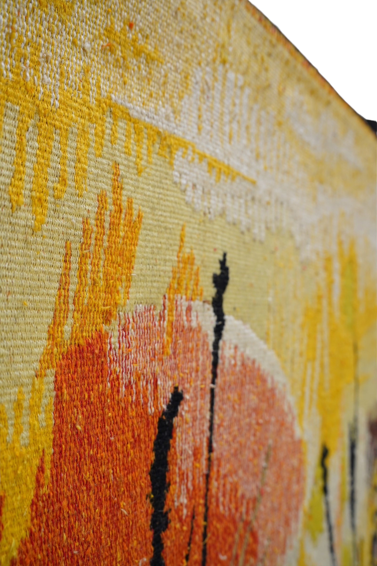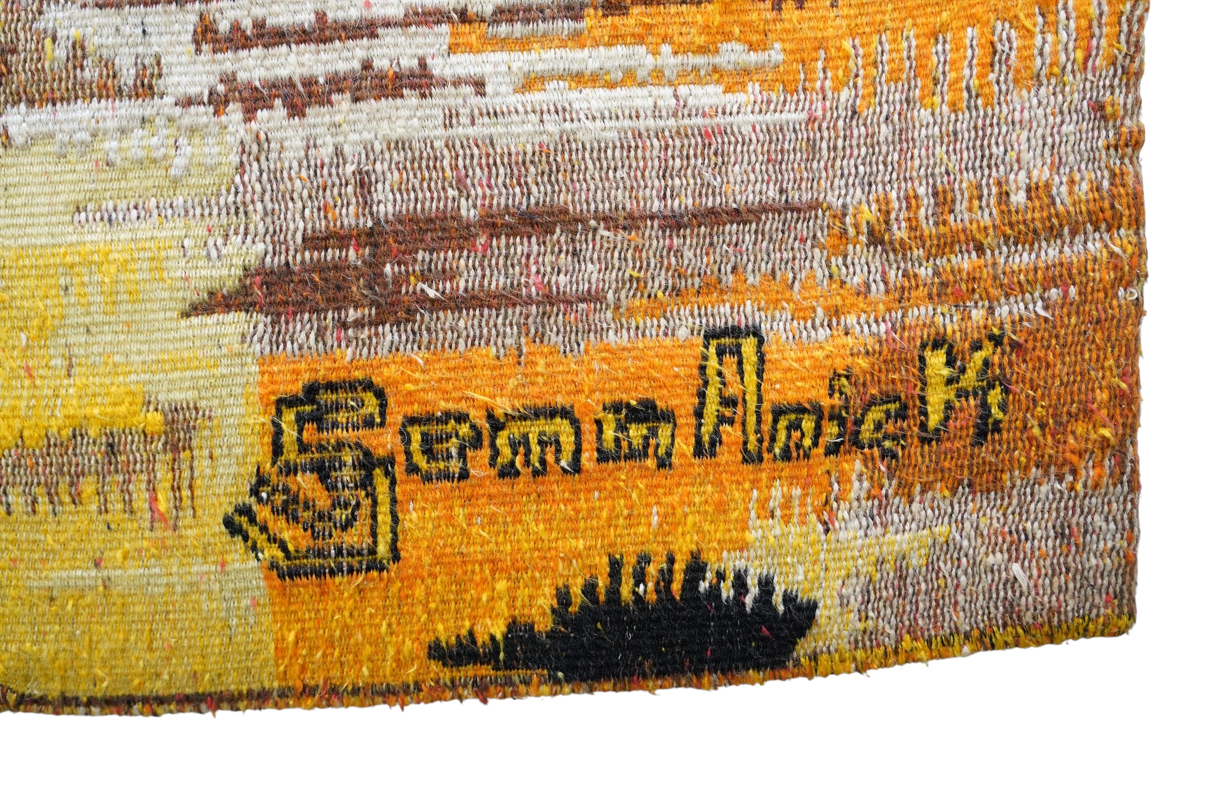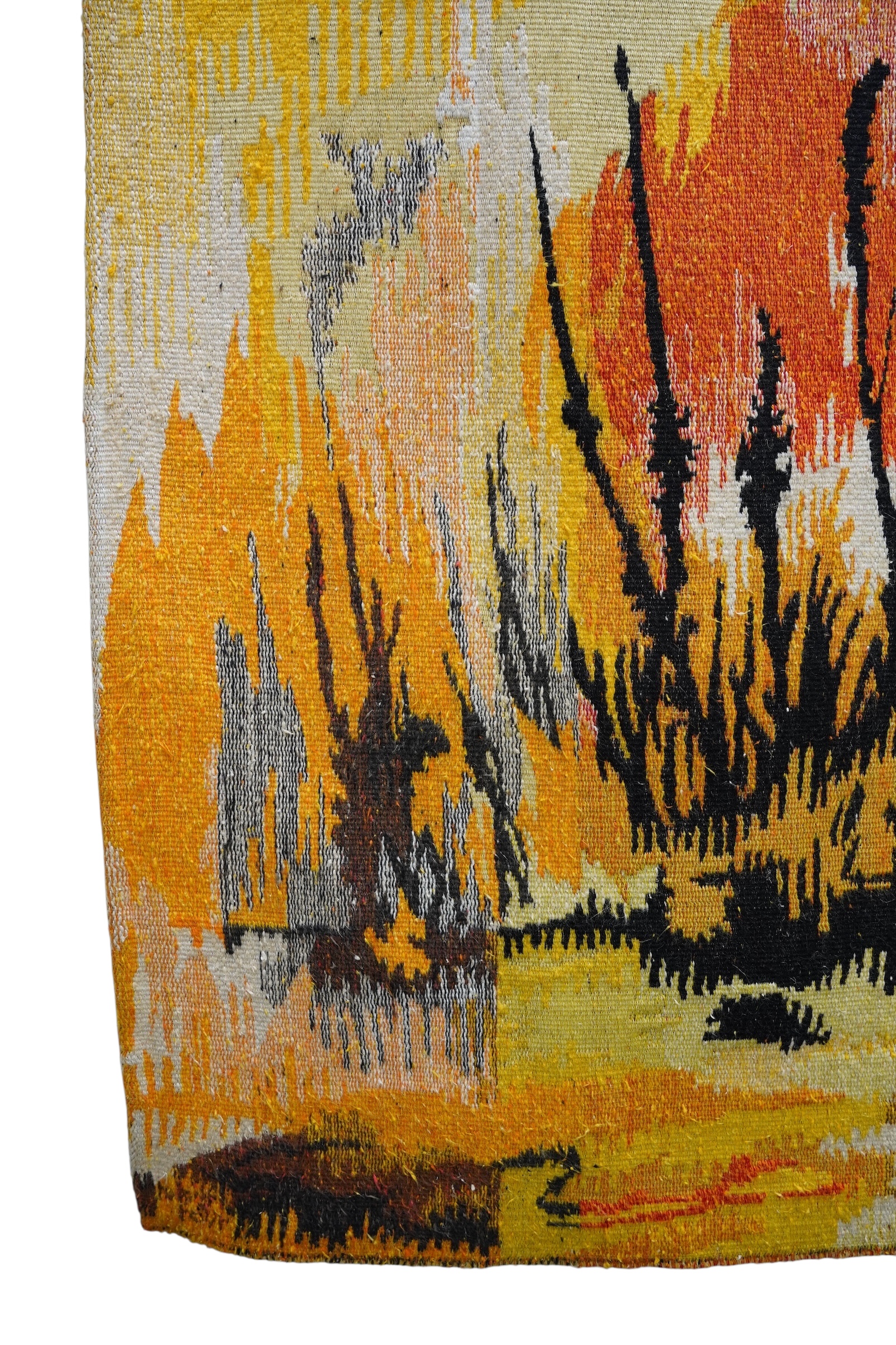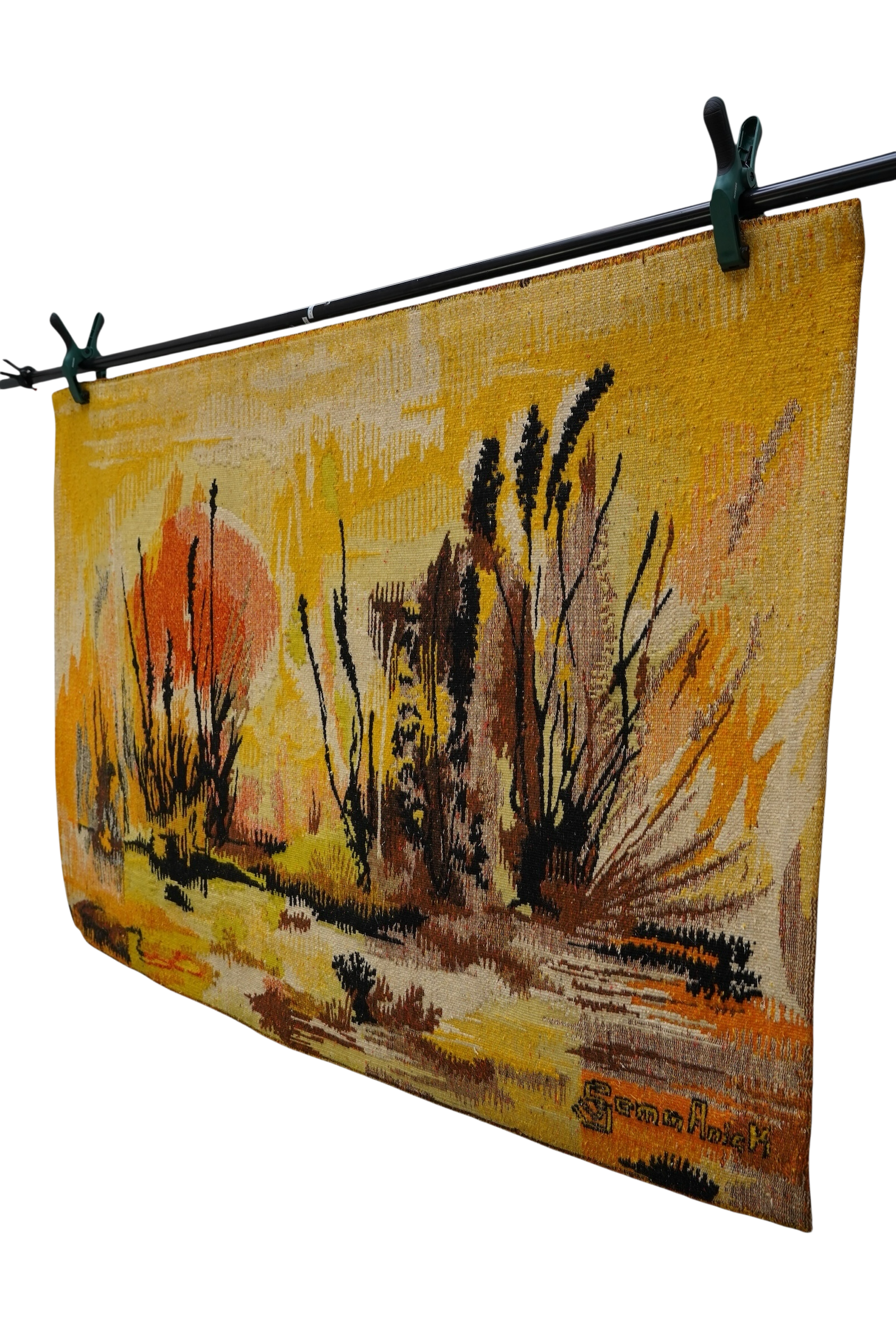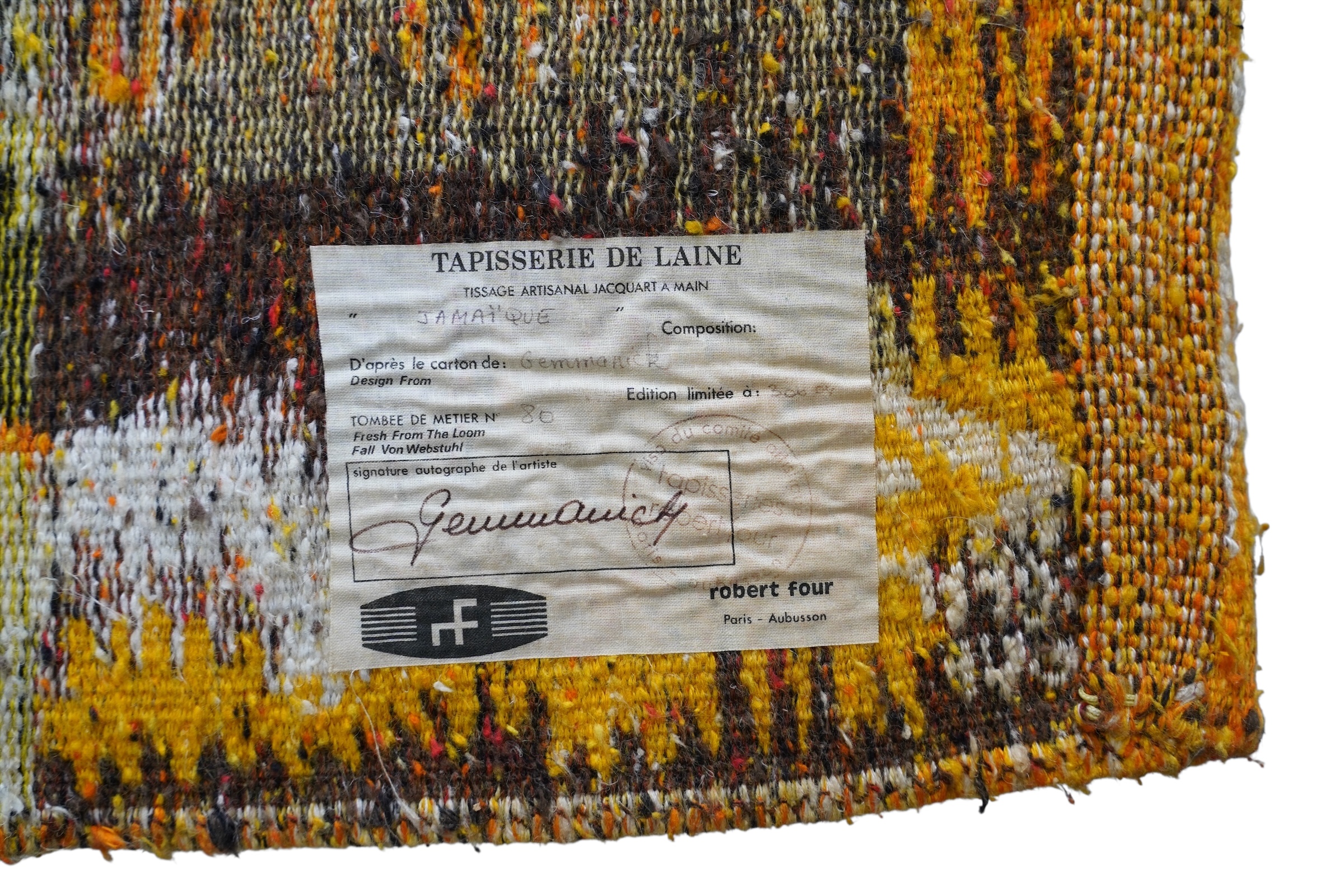 Tapisserie murale réalisée par un tissage artisanale jacquard en laine de l’artiste Gammanick, édition numéroté  et limitée par les ateliers parisiens « Robert Four », 1970’s. Représentation d’un paysage « Jamaïque ».