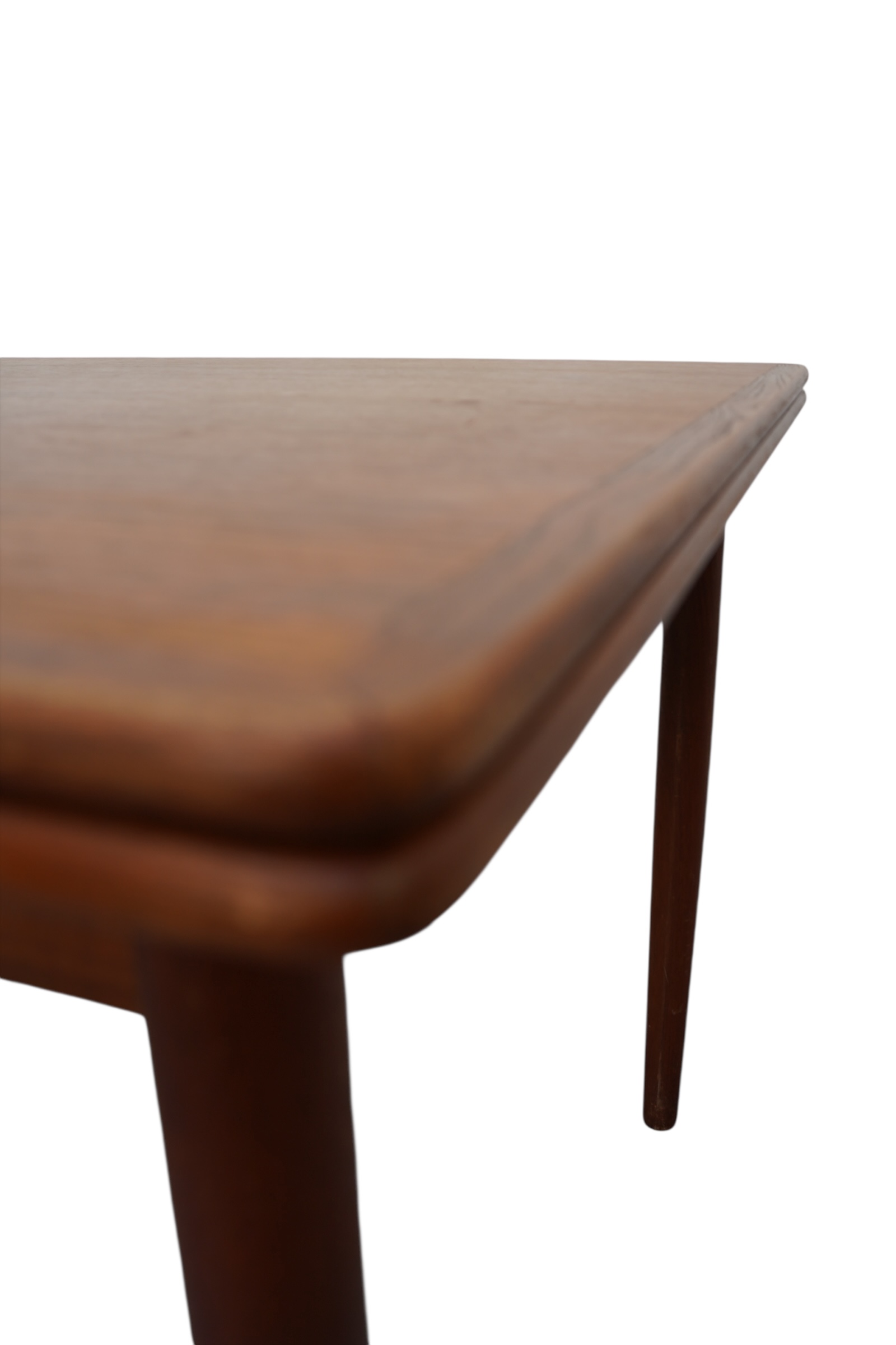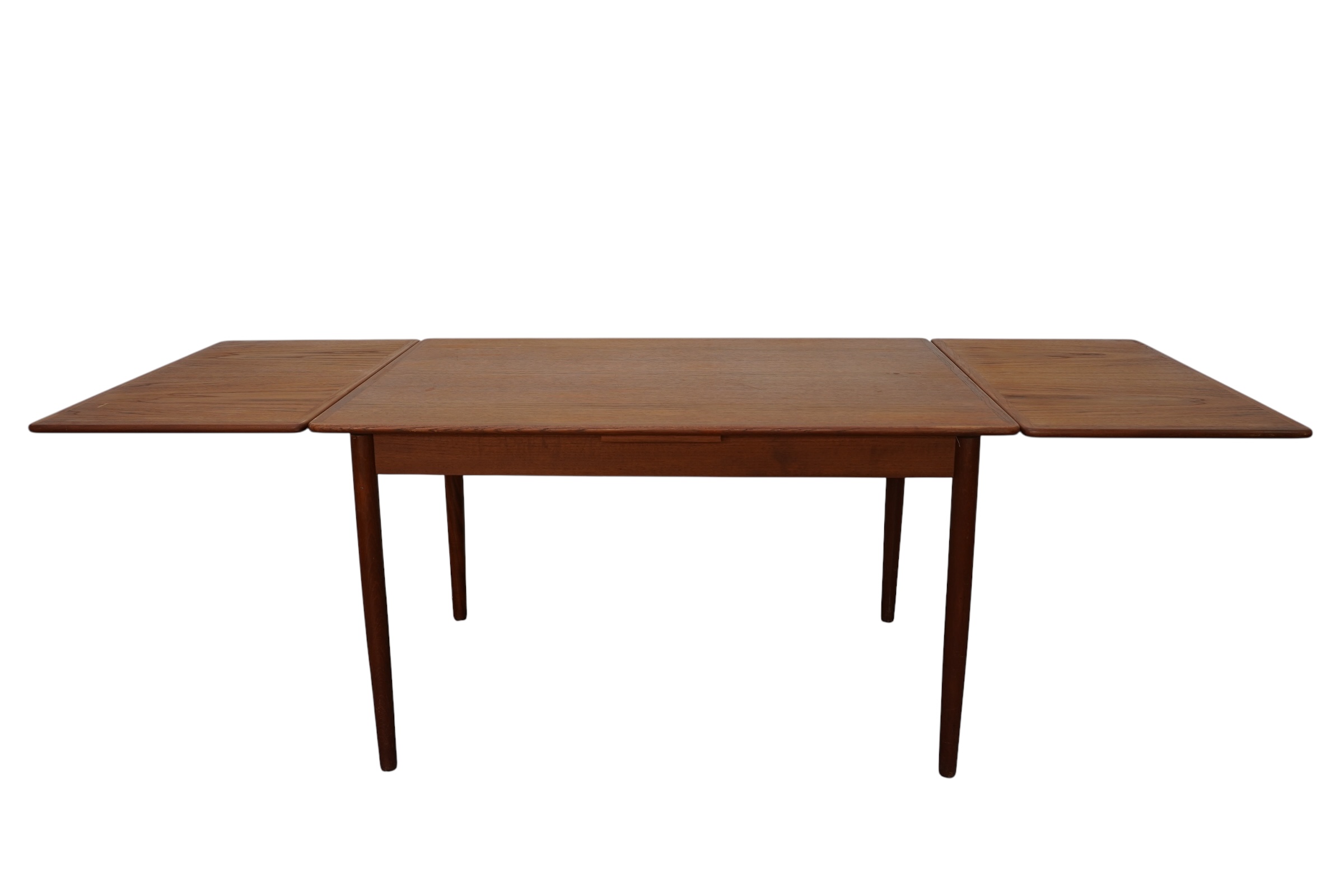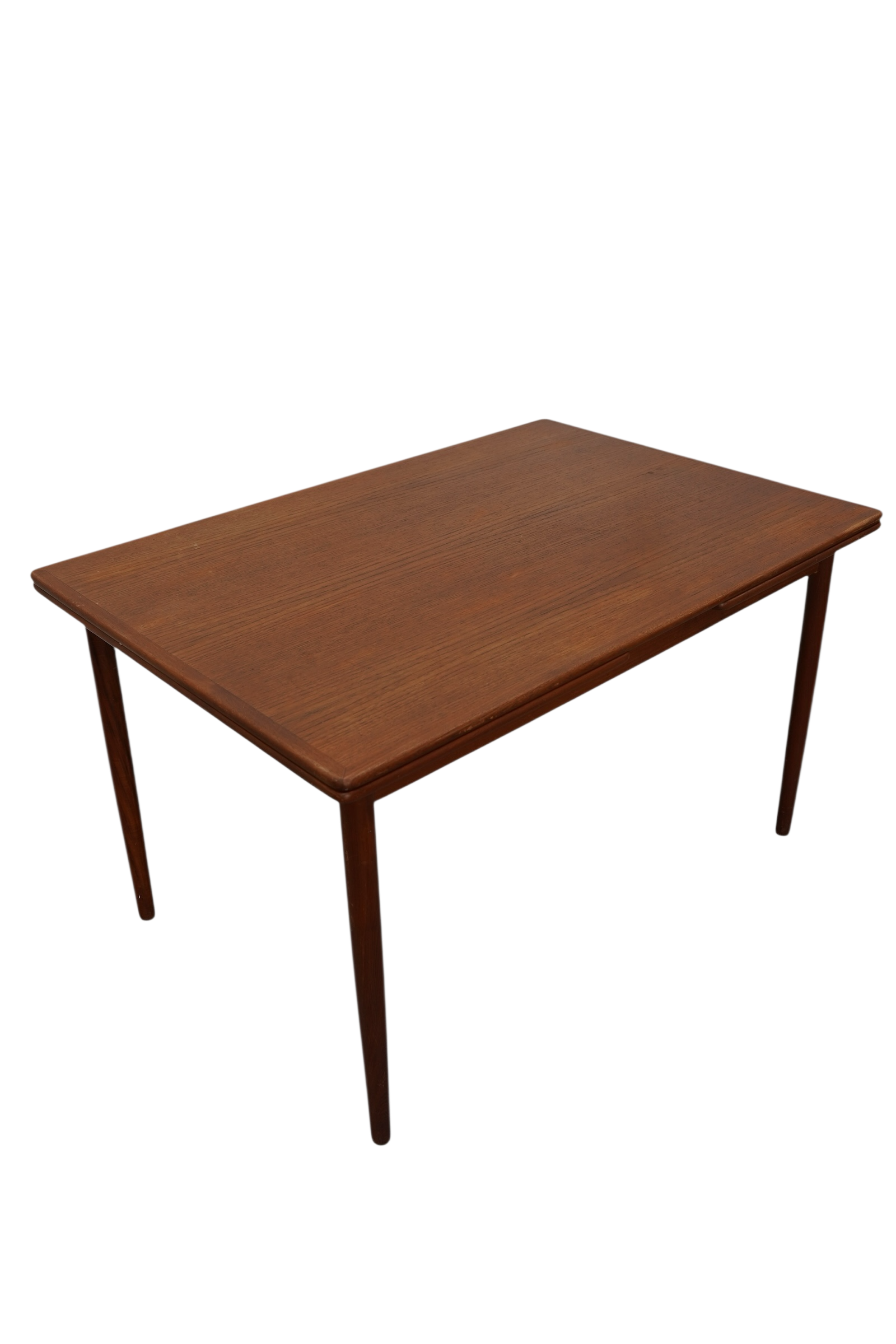 Table de salle à manger extensible modèle 145 conçue par Willy Sigh & Søn Møbelfabrik au Danemark vers 1960’s. De forme rectangulaire, cette table en bois de teck peut accueillir jusqu’à 10 personnes, grâce à ses deux rallonges supplémentaire. Le grain du bois naturel, ravit avec des bords arrondis. Il présente un savoir-faire de haute qualité qui améliore l’élégance du design danois du milieu du siècle. Pieds coniques cylindrés démontables. Rebord arrondis, sobre et élégante à la couleur et au grain de couleur chaud.